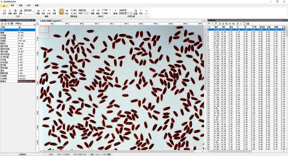 5、能自動測出各類粘連種粒的每粒粒形參數(長、寬、長寬比、面積、等效直徑、周長等),能精準顯示種粒外接矩形,并可自動排序輸出,及可輸出粒徑分布圖表。